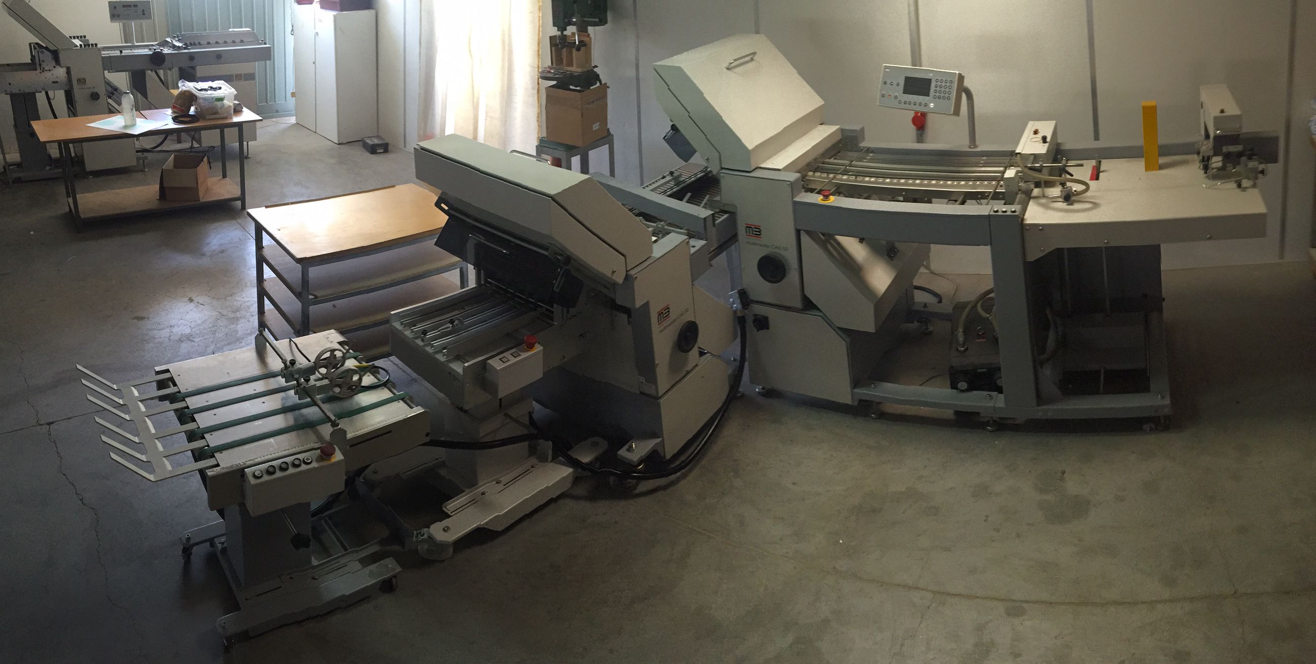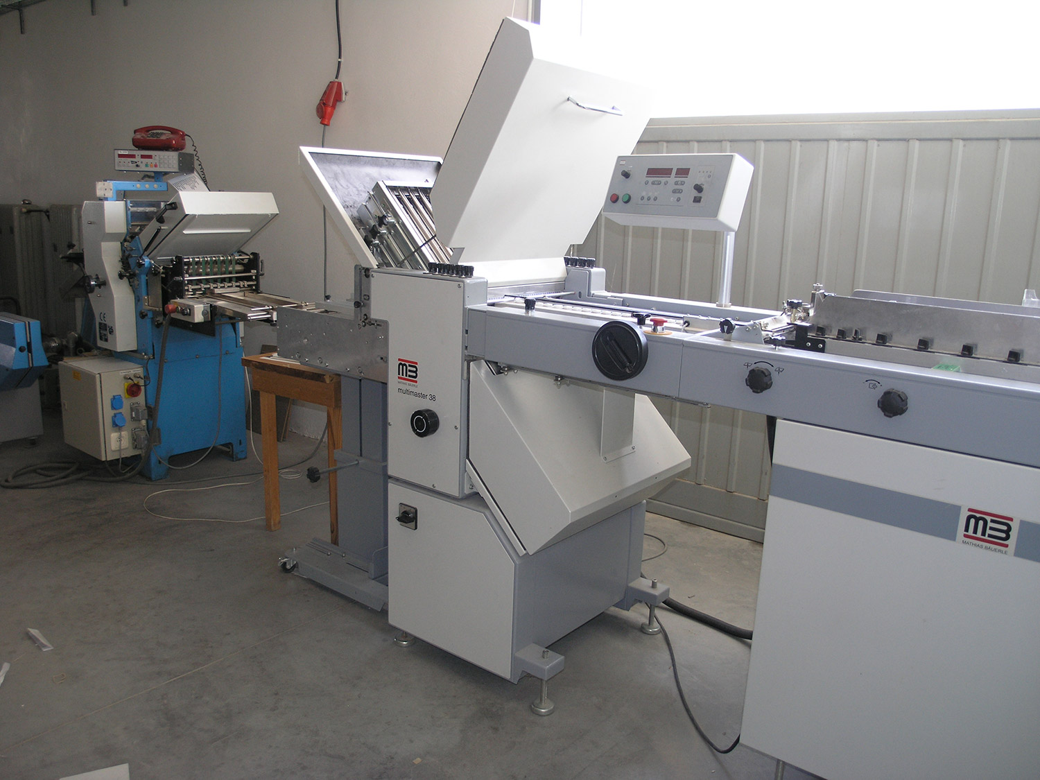 Bookbinding Muller-Martini machine with 8 towers and folding machines with 6 pockets with possibility to 7 degrees from parallel 70x100 and cross folds for pharma with a final figure up to 8 mm.